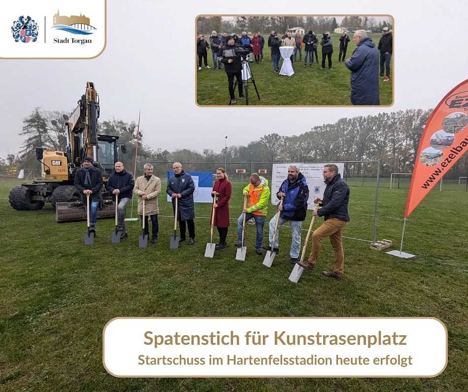 Gemeinsam vollzogen sie den symbolischen Startschuss für die Bauarbeiten. Bis Mai nächsten Jahres soll der Platz dann vollendet und bespielbar sein. Jahrzehnte hoffen die Fußballer des SC Hartenfels schon auf diesen Meilenstein für ihre Vereinsgeschichte. Vor knapp einem Jahr, im Dezember 2023, flatterte der positive Fördermittelbescheid der SAB beim Verein ein. Im Sommer sagte der Torgauer Stadtrat per Beschluss seine nicht unerhebliche finanzielle Unterstützung zu, wohlwissend, wie wichtig dieses Projekt für die Sportwelt in Torgau ist. Bis zum Spatenstich war es aber noch ein weiter und nicht immer einfacher Weg, dessen erste und wahrscheinlich wichtigste Etappe jetzt geschafft ist.